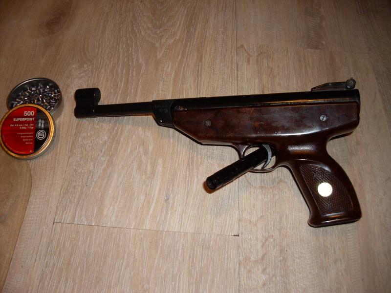Bewährte Luftpistole Weihrauch HW 70. Ohne Rost und sonstige optische Beschädigungen.Abzug und Visier fein einstellbar. Der Knicklauf rastet straff ein wie es sein soll. (Kugelverschluss siehe Bild 3) Die Pistole schießt. Laufdichtung etwas hart, sollte evtl. erneuert werden. Gibt es für ca. 3 Euro bei diversen Shops. Insgesamt eine schöneLuftpistole in bewährter Weihrauch-Qualität. Feder noch sehr straff. Sehr geringe Schussbelastung. Liegt seit Jahren eingölt im Tresor.