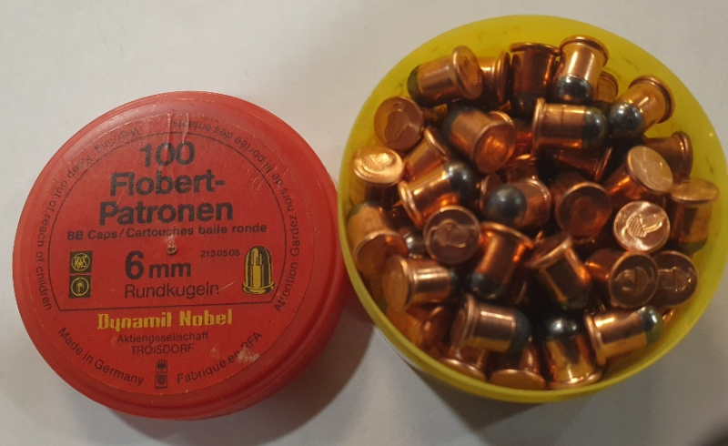 Etwas mehr als 100 Flobert Patronen 6 mm mit Rundkugel. Neben der abgebildeten Dose gebe ich noch eine zweite Dose mit einigen Patrönchen dazu. So sind es in jedem Fall 100 Stück +. Beide Dosen von Dynamit Nobel, es sind jedoch unterschiedliche Losnummern.
