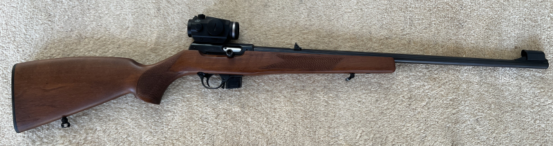 ***CZ511 Selbstladebüchse, BJ 1992***Funktion, Brünierung und technischer Zustand sehr gut***Schaftholz gepflegt und mit schöner Maserung, linksseitig mit einem größeren Kratzer (s. Fotos), bereits mit diesem Kratzer von mir gekauft***Magazin 8-schüssig***Klappvisier 50/100 m mit Korntunnel***leicht abnehmbares HAWKE-Rotpunktvisier z.B. für Training auf Klappscheiben.***Nach meinem Kenntnisstand die einzige (serienmäßig gefertigte) .22lfB-Selbstladebüchse, bei der alle Systemkomponenten aus Stahl sind.***Die Büchse schießt sehr zuverlässig und mit gutem Trefferbild, die passende Munition natürlich vorausgesetzt. *** Ich verkaufe sie, weil ich nicht mehr zum Schießen komme.*** Die Fotos sind Bestandteil der Beschreibung.*** Privatverkauf ohne Garantien, Gewährleistungen und/oder Rücknahme. ***