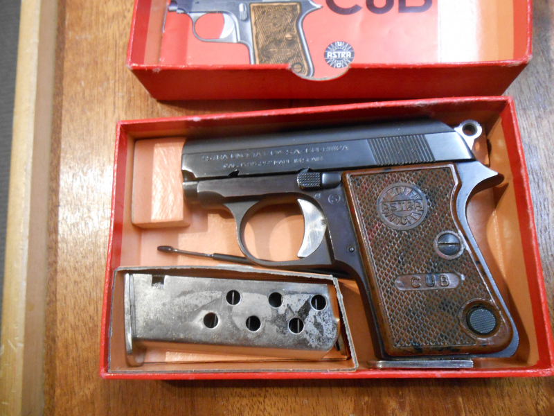 ASTRA CUB im Kal 6,35 Browning. Waffe im Neuzustand mit Schachtel, Bedienungsanleitung, Reserve Magazin und Putzstock.