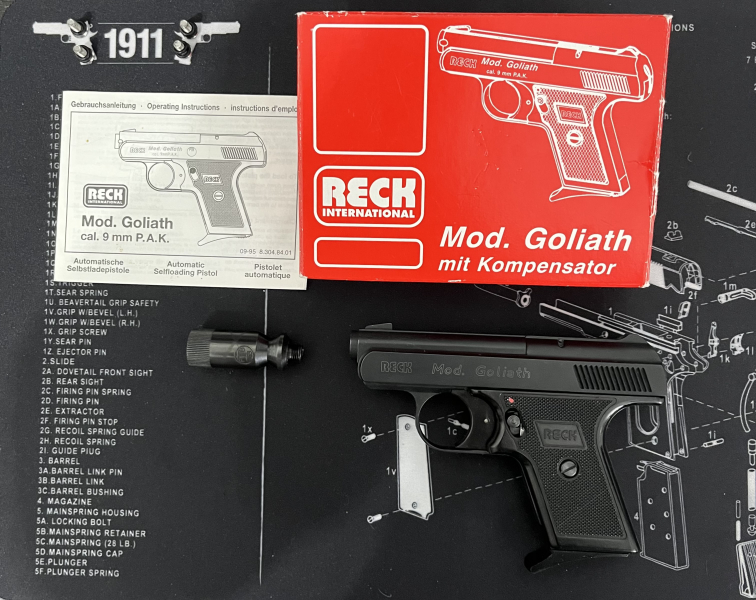 Aus meiner Sammlung verkaufe ich eine nicht mehr hergestellte Reck Goliath 9 mm P:A:K sie ist die kleinste Schreckschusspistole zur Selbsverteiligung spetziell für die Dame aber auch mit dem Raketenbecher für Sylvester einsetzbar. Sie wiegt nur 420 g und ist 134mm lang . Sie kann also leicht in der Jackentasche gesteckt werden, sie hat eine Magazinkapazität von 4 Schuss 9mm P.A.K Schreckschuss oder Pfeffer - Gaspatronen. Die Pistole ist in einem neuwertigen Zustand, wurde nur einmal zur Probe abgefeuert ansonsten nicht getragen oder bespielt. Also wie neu. Solide gebaut und eigentlich unkaputbar. Sehr rahr und selten zu bekommen.
