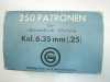 Sie bieten hier auf 250 Stück Orig.-Packung, Geco-Patronen Kal. 6,35 mm, ein Los. Privatverkauf, keine Rückgaberecht und Gewährleistung. Der Bieter erklärt sich durch sein Gebot mit diesen Bestimmungen einverstanden. Privatverkauf, kein Rückgaberecht und Gewährleistung. Der Bieter erklärt sich durch sein Gebot mit diesen Bestimmungen einverstanden.