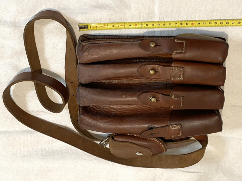 Magazintasche mit Gurt aus Leder, gebraucht, Zustand siehe Fotos. Ein Messing-Pin ist lose, aber vorhanden und wird mitgeliefert.