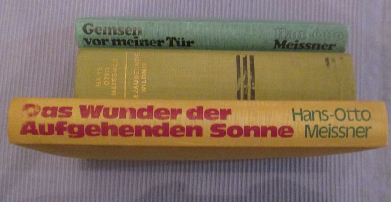 Im Band Bezaubernde Wildnis erzählt der zu seiner Zeit erfolgreiche Reiseberichterstatter und Jäger Hans-Otto Meissner von seinen jagdlichen Erlebnissen und den Reisen in der Einsamkeit Alaskas. Im Band Gemsen vor meiner Tür erzählt er von seinen Jagderlebnissen in Tirol. Im Band Das Wunder der aufgehenden Sonne erzählt Meissner von seinen Reisen nach Japan. Der Zustand der Bücher ist altersgerecht gut. Im Inneneinband hat ein Vorbesitzer seinen Namensstempel angebracht.