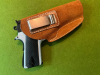 Es handelt sich hier um ein Steck/Innenbundholster, das am Bund eingesteckt sowohl rechtshand als auch linkshand getragen werden kann. Es besteht aus hochwertigem, weichen braunen Wildeder, ist offen am Lauf, und ist als reiner Schnellzieher ohne jeglichen Verschluss gestaltet. Hier sichtbar auf der Rückseite