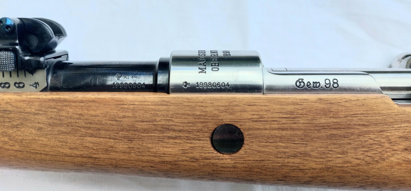 Repetierbüchse - Gewehr Modell 98 Herst.: Fa. Mauser-Werke Oberndorf a. Neckar - Limitierte Auflage: SN: 1998-0001 - 1998-1998 - Kal.: 8 x 57mm JS – SN: 1998-0604 - Nrgl. - Dt. Beschuss 1997 - Magazin:5+1 Schuss - Lauflänge:75 cm, innen sehr gut - Gesamt-, Lauf-, Schaftlänge: 126 /75 /35,5 cm - Gewicht: 4,1 Kg - Visierung: Originalsystem bis 2000 m