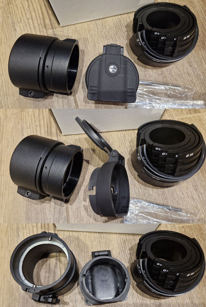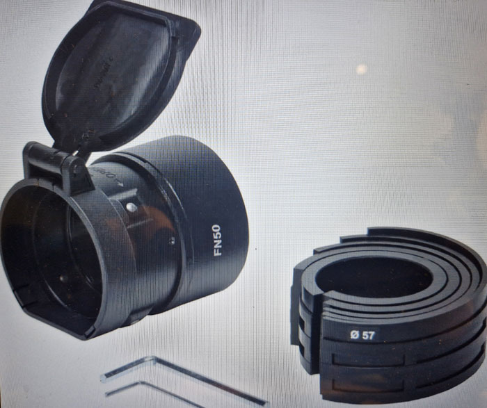 Diese spezielle Montageeinheit ermöglicht eine stabile Halterung an einem Zielfernrohr, Spektive, Fernglas oder einer Kamera. Der FN50mm wird mit einem Satz von Übergangsringen geliefert, wobei die Wahl des entsprechenden Rings vom Aussendurchmesser des Objektivgehäuses der Tagesoptik bestimmt wird. Tagsüber, wenn der Aufsatz nicht verwendet wird, dient der Klappdeckel-Adapter-Aufsatz als Schutzabdeckung der Tagesoptik-Linse.
