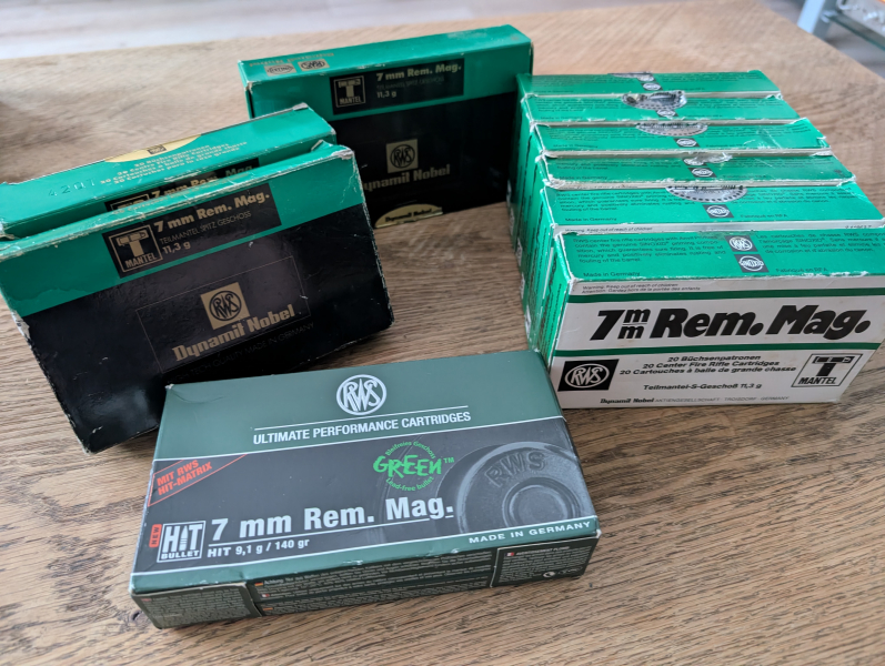 Biete hier durch Jagdaufgabe folgende Original RWS 7mm Remington Magnum Patronen an. Gesamtzahl 180 Stück. Aufgeteilt in: 15 Schuss mit HIT Geschoss 9,1 g sowie 60 Schuss mit Kegelspitzgeschoss 10,5 g sowie 85 Schuss Teilmantelspitzgeschoss 11,3 g sowie 20 Schuss mit Original Brenneke Torpedo Idealgeschoss 11,5 g. Privatverkauf, keine Garantie, keine Rücknahme. Achtung: Verkauf nur an Selbstabholer. Abholort Solingen.