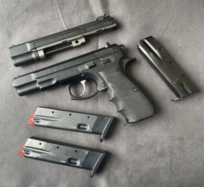 Sehr schöne CZ 75B im Kaliber 9mm Luger mit Wechselsystem Kadet im Kaliber .22lfB, Zustand ist gebraucht aber sehr schön, Kunststoffschalen sind auch noch dabei, siehe Bilder