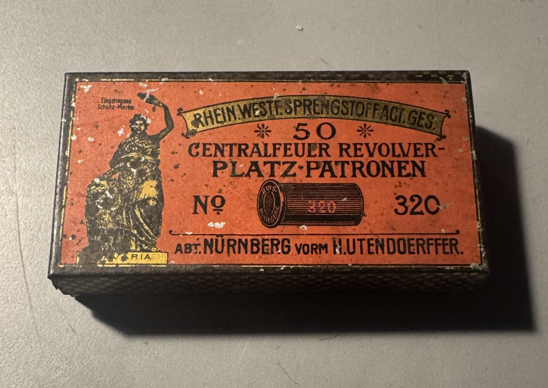 Biete eine alte, leere Blechdose von RWS / H. Utendoerffer .320 Centralfeuer Revolver Platz-Patronen an. Die Dose ist schon älter, für Sammler sicherlich interessant. Zustand; leichte, altersbedingte Gebrauchsspuren vorhanden, keine Beschädigungen. Versandkosten trägt der Käufer. Privatverkauf! Keine Garantie! Keine Rücknahme!