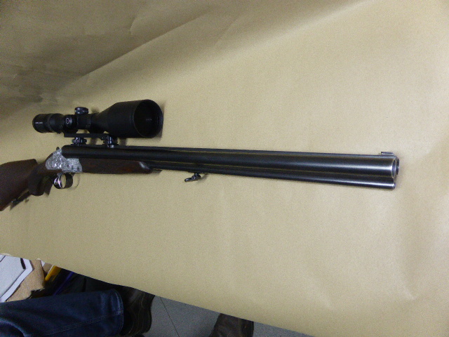 und Einstecklauf im Kaliber .22 Magnum ebenfalls aus dem Haus KRIEGHOFF. Die Waffe ist montiert mit einem neuen Zielfernrohr von Schmidt & Bender in 2,5 -10 x 56 Absehen 4 mit Leuchtpunkt auf neuer Henneberger Schwenkmontage. Der Drilling ist mit langen Seitenplatten und beidseitiger schöner Jagdgravur auf der linken Seitenplatte ein Rehbock mit Ricke und rechts ein Hirsch mit Kahlwild ausgestattet. Die Lauflänge beträgt 60cm, der Schaftabstand beträgt 35,5cm kann nach oben oder unten verlängert oder verkürzt werden,