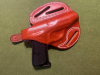 Pancake Holster, mit 3 Gürtelschlitzen die die Möglichkeit die Waffe auf 2 Winkel zu tragen bieten. Es besteht aus hochwertigem, formstabilen Braunleder, Rechtshand, ist offen am Lauf, mit einem stabilen Druckknopfverschluss und die Gürtelschlitzen, hier auf der Rückseite sichtbar