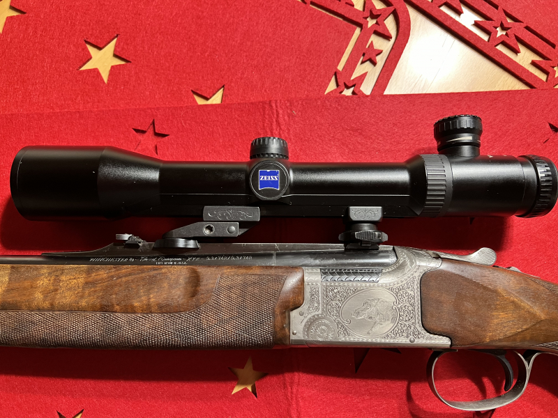 Wenig geführte Winchester Doppelbüchse XTR im Kaliber 9,3 x 74 R mit Ejektor, einschliesslich Zeiss Varipoint 1,5-6 x 42 mit Absehen 56 und Leuchtabsehen.