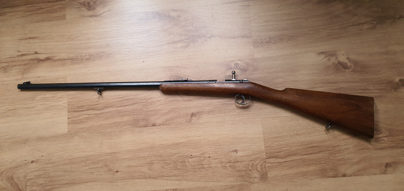 Kaliber .22lr mit Handspannung und Achtkantlauf, offene Visierung mit Kimme und Korn