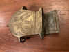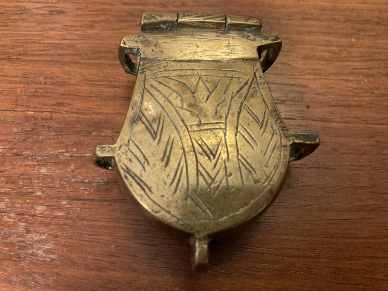 Hier versteigere / verkaufe ich aus einem Nachlass einen " Messing " Behälter für Pulver oder Bleikugeln oder ect.-. Er hat einen gut festsitzenden Deckel / Verschluss und auf beiden Seiten je 2 Ösen und unten eine Öse, für eine Gurt- oder Lederriemen- Befestigung. Vorder-und Rückseite verziert, der Deckel oben auch. Gewicht ca. 150 Gramm. Er hat bestimmt einige Jahre auf dem Buckel. Es gibt leider keinen Hersteller oder einen anderen Stempel. Höhe ca. 6,5 cm, Breite ca. 6 cm mit den Ösen, die Öffnung-Länge oben ca. 3,8 cm, Breit ca. 1,5 cm. Privatverkauf. DHL-Versand innerhalb Deutschland.