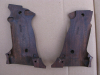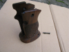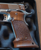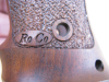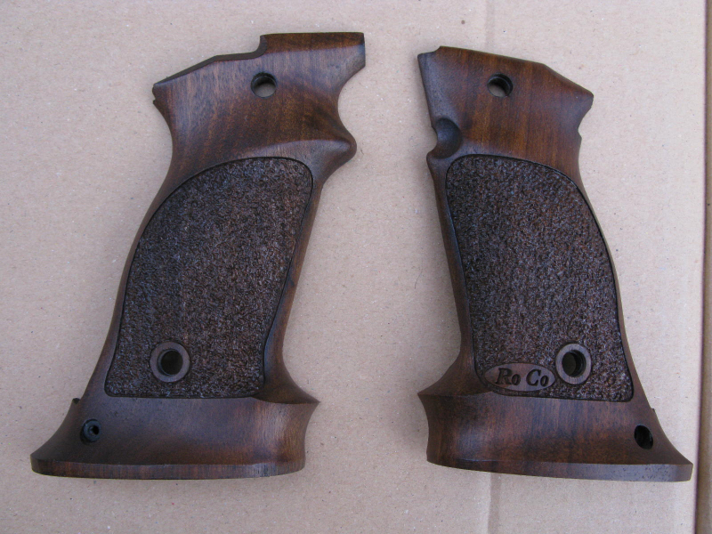 Diese hier sind etwas ballig ausgeformt, die Waffe liegt sehr sicher und definiert in der Hand. Sie haben Ausnehmungen für die beidseitige Sicherung (siehe Bilder von der Innenseite) und werden mit den Schrauben der Originalgriffschalen befestigt. Somit liegen keine Befestigungsschrauben bei (Diese gibt es ja in allen Qualitäten zu kaufen), die kleine Schraube, die die Schalen unten direkt miteinander verbindet liegt aber bei. Die Schalen haben die üblichen Gebrauchsspuren, sind aber noch in einem sehr ordentlichen Zustand. Das Holz ist von schöner Maserung und Farbe, die Oberfläche ist teils griffig punziert, teils schön glatt ausgeführt. Da die Griffschalen nach unten über das Waffengriffstück herausragen, bilden sie eine Art Jet Funnel.