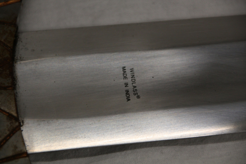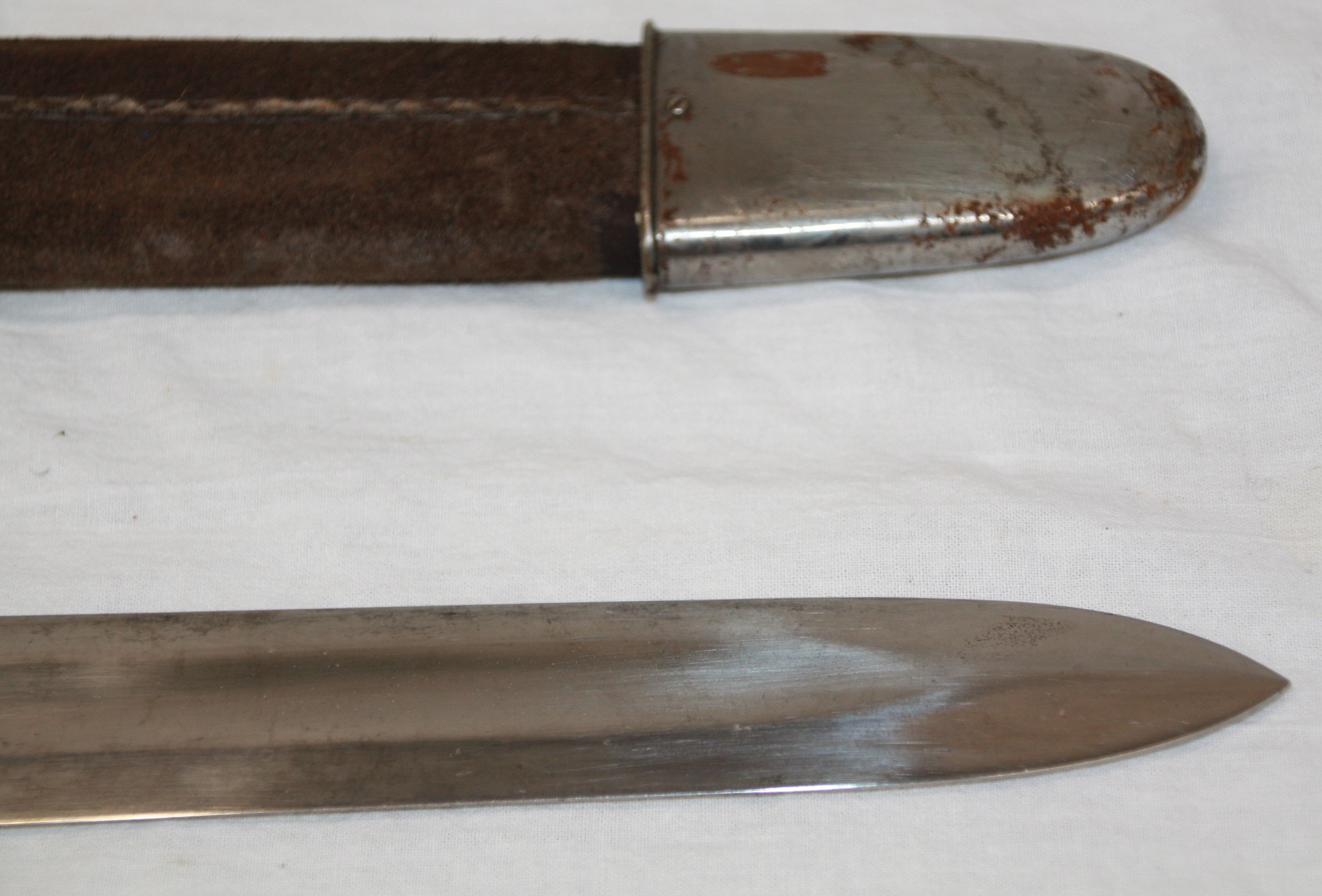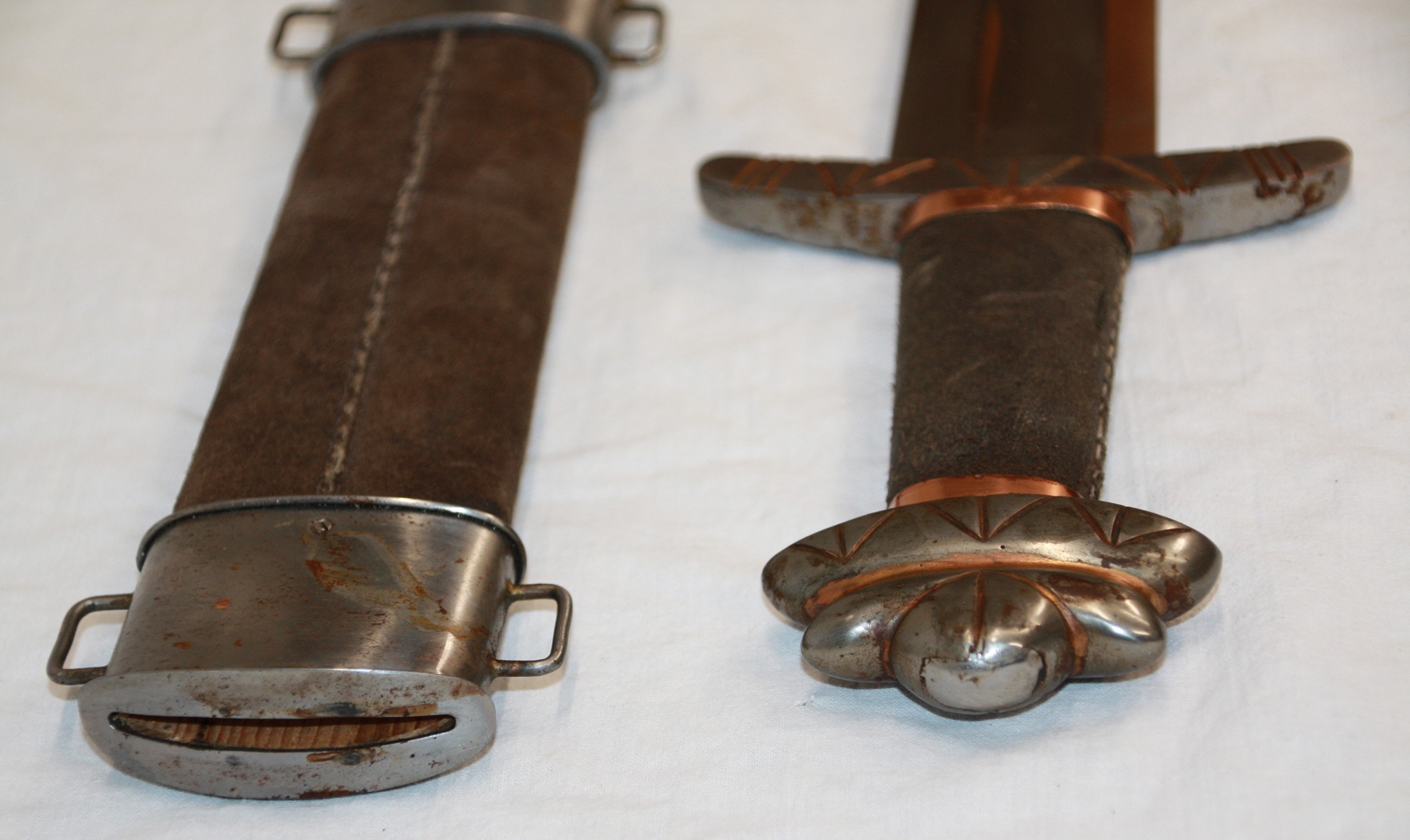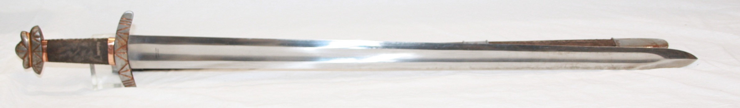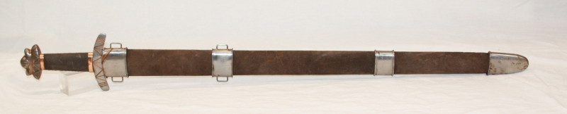 Qualität-Repro, komplet mit Scheide in braunes Veloursleder. Total 94 cm. Klinge 78,5 cm. Gewicht 1,5 kg.