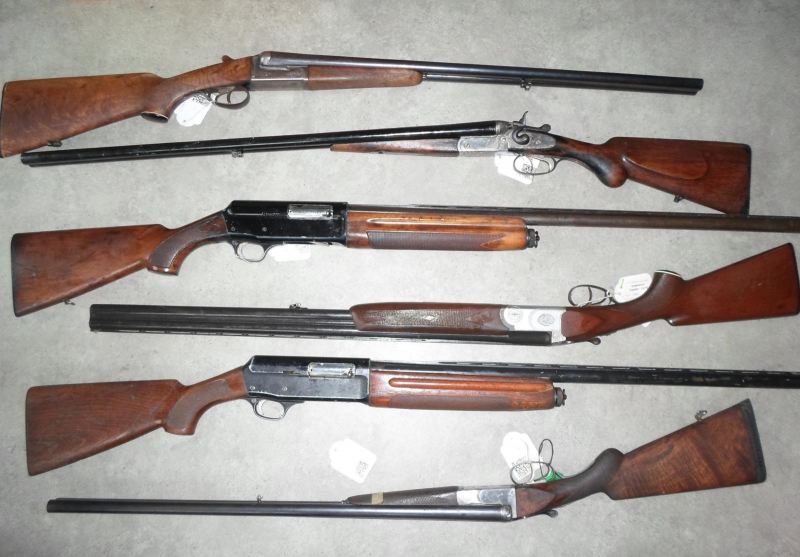 Konvolut von 6 Flinten: 2 Doppelflinten, 1 Hahndoppelflinte, 1 Bockdoppelflinte und 2 Selbstladeflinten. Aufgrund des Alters erfolgt der Verkauf als defekt.