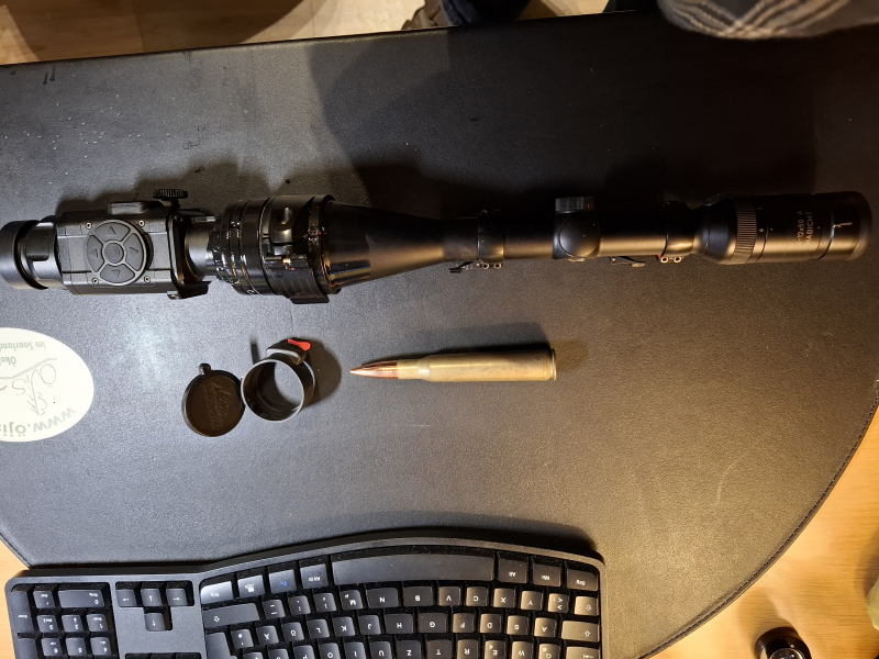 Das Vorsatzgerät ist mittels eines Smartclip AS D56 Klemmadapter 56mm auf ein Zielfernrohr der Marke Swarovski ( Habicht ) 4-12x50 aufgesetzt und mit Plombierlack verrutsch sicher montiert.