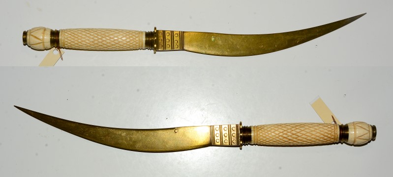 Großes afrikanisches Messer mit 25 cm langer gekrümmter Klinge, der Knauf sieht nach Bein aus und möglicherweise ist der Griff selbst auch aus Bein, keine Scheide, sicher keine zum Kampf bestimmte Waffe auch wenn die Schneide recht scharf ist