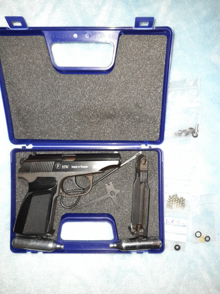 Makarov/Baikal MP 654K, Eine seltene Pistole, Erstaufführung. Es wurde auf Dichtigkeit und Funktion geprüft. Da zu lege ich eine Wartungs CO2 Kapssel und eine normale und ein paar Kugeln, damit man direkt das Teil ausprobieren kann , Ersatzdichtungen und ersatzventil. Magazin ebenfalls nummerngleich, der zweite Magazin war ein Ersatzteil spender, von den wurde Ventilsitz für originale Magazin genommen, der ist also leer.wirklich schönes Sammlerstück, sehr wenig benutzt.