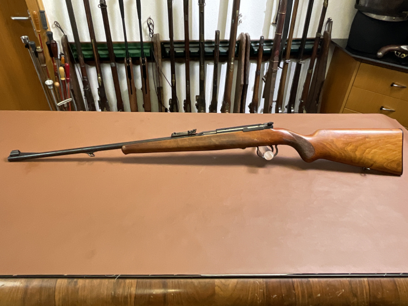 Zum Verkauf steht eine Repetierbüchse Mauser Oberndorf im Kaliber .22 LR. Die Waffe weist durch frühere, schlechte Lagerung leichte Rostnarben an der originalen Brünierung auf. Sie verfügt über eine Schiebevisierung von 30 bis 200 Metern sowie eine Flügelsicherung wie beim K98.
