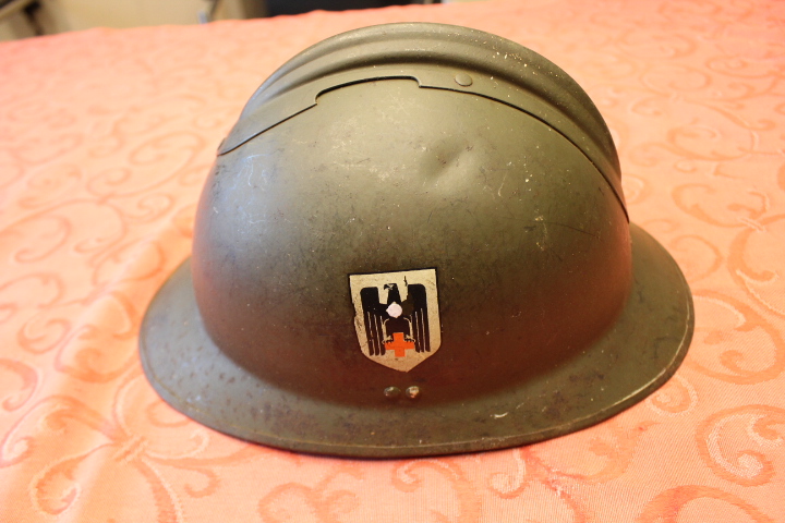In noch unberührtem Fundzustand. Habe den Helm schon vor Jahrzenten im Elsass (Frankreich) gefunden. Kinnriemen fehlt. Garantiert Original WKII. Porto EU= 19,50€