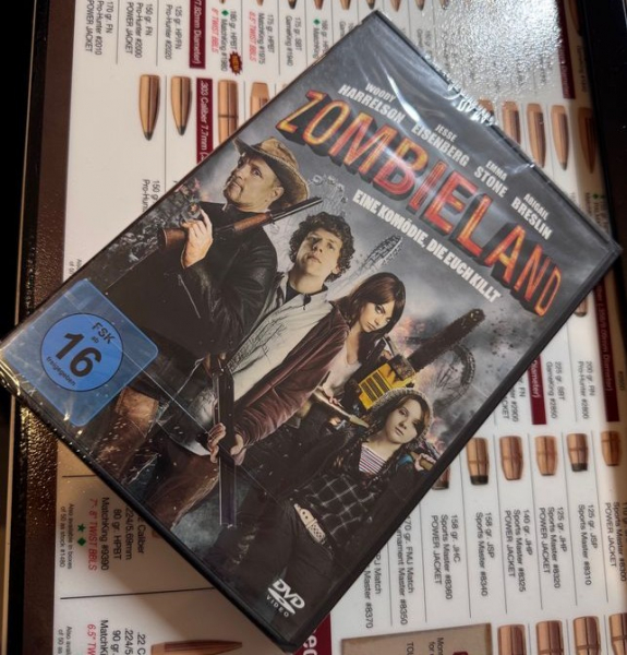 Zum Verkauf steht die DVD „Zombieland“, eine äußerst erfolgreiche Horror-Komödie, die Action, schwarzen Humor und Zombiethema auf unterhaltsame Weise verbindet.