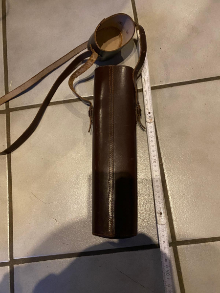 Guter Zustand, Ca. 35 cm lang, Öffnung ca. 8 cm, mit funktionierendem Verschluss mit Lederriemen.