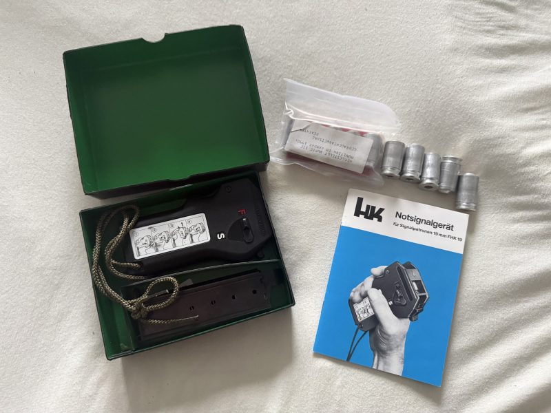 Sie kaufen hier ein seltenes vollständiges Notsignalgeräte-Set mit ein dazugehörigen Magazin von Heckler & Koch im Kaliber 19x36mm im Neuzustand mit Originalkarton,Bedienungsanleitung,Sicherungsschnur und 6 Patronen ( 2 Stück in Farbe Weiß + 2 Stück in Farbe Grün + 2 Stück in Farbe Rot ).Diese Patronen sind schon alleine 80,-€ wert.Die Bedienungsanleitungen sind bei mir auch in anderen Sprachen ( Englisch & Spanisch & Französisch) verfügbar und extra kaufbar.Unvollständige Set's werden hier mal öfters Angeboten und sind meiner Meinung nach raus geschmissenes Geld.Aber echte Sammler wissen mein Angebot,das ich hier für Sie mache zu Schätzen. Das Gerät wurde in Kooperation mit Heckler & Koch in den 1960er Jahren entwickelt und in den 1970er Jahren wurden die ersten Geräte bei der Bundeswehr eingeführt, bevorzugt bei der Luftwaffe. Das hier zu ersteigernde H&K Notsignalgerät befindet sich in einem Neuzustand,es hat die PTB-Nummer 416 und ist somit frei ab 18 Jahren zu erwerben. Das Kunststoffgriffstück ist Glasfaserverstärkt (wie bei den H&K Pistolen), viele Bauteile und das Magazin sind aus Stahl. Das Gerät funktioniert halbautomatisch:Das Magazin wird mit 5 Patronen geladen, in den Magazinschacht gesteckt, die Magazinsperre rastet automatisch ein. Dann wird der Hahn von Hand gespannt, und der Sicherungshebel von S auf F umgestellt, bei einer Notsituation betätigt man den Abzug. Es wird ein gut spürbarer Rückstoß erzeugt, und das H&K ist etwas lauter als eine 9mm Pistole, da es keinen Lauf besitzt. Der Vordere Teil der Patrone steigt bei einem steilen Schuss ca. 65 Meter in die Höhe, der hintere Teil der Patrone wird durch die nachrückende Patrone ausgeworfen. Eine Signalpatrone erzeugt ca 10.000 CD und ist extrem hell!. Mit dazu gibt es den Originalkarton eine Bedienungsanleitung und 6 Patronen in der Farbe Weiß,Grün,Rot.Das auf Bild 5 noch zu erkennende 2te Magazin rechts ist bereits Verkauft und wird auch nicht geliefert.Die 6te Patrone die auch geliefert wird befindet sich nicht auf dem 5ten Bild,da sie sich im Magazin im Gerät befindet Das Mindesthaltbarkeitsdatum der Patronen ist überschritten, sie wurden aber immer trocken gelagert. Sie bieten hier als auf ein vollständiges komplett-Set. Altersnachweis erforderlich,nicht von ID-Mitgliedern.HINWEIS: Die Artikel werden wie abgebildet und beschrieben angeboten/geliefert und von mir als Privatperson verkauft. Ich schließe jedwede Gewährleistung oder Haftung (EU-Recht etc.) aus. Rücknahme und/oder Nachverhandlungen sowie Kaufpreisrückerstattung finden nicht statt. Kaufen Sie nur wenn Sie damit einverstanden sind und stellen Sie Ihre Fragen bevor Sie kaufen. Der Versand erfolgt immer nur am Freitag nach erfolgten Geldeingang an mich und der an die von Ihnen hier bei egun hinterlegten Adresse als versichertes DHL-Paket für 9,00,-€ mit Sendungsverfolgungsnummer,die dem Käufer mitgeteilt wird.Versand in die EU per DHL-Paket für 27,-€. Für den Fall, das die Ware auf dem Postweg verloren geht,oder beschädigt wird, übernehme ich keine Haftung und leiste keinen Schadenersatz. Bitte nehmen Sie die Zahlung innerhalb von 5 Tagen nach Ihren Kauf vor. Auch können Sie mir gerne ein anderen Sofort-Preis-Kaufangebot für das Notsignalgerät-Set machen.++Bitte meine weiteren Auktionen beachten+. Gruss K.K.