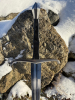 Die lange zweischneidige Klinge mit ausgeprägter Mittelkehle, die schlichte gerade Parierstange sowie der facettierte Knauf ergeben eine sehr glaubwürdige Silhouette. Der verschraubte Knauf ist typisch für moderne Repliken und sorgt für eine stabile Verbindung der Bauteile.