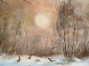 • Verschneite Birken im Vordergrund • Einen teilweise zugefrorenen Bach • Einen Fasan in der Schneelandschaft • Warme Sonnenuntergangsstimmung im Hintergrund