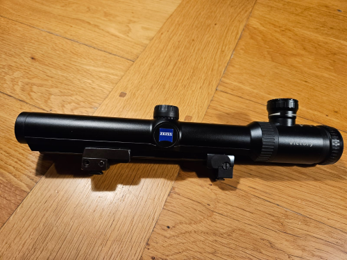 Verkaufe für einen Freund ein Drückjagdzielfernrohr Zeiss Varipoint 1,1-4x24 Leuchtabsehen 0 - nur Punkt ohne Balken (schwarz oder beleuchtet) mit Zeiss-ZM-Schiene. Sehr guter Zustand praktisch ohne Gebrauchsspuren. Das ZF war gerade erst beim Zeiss-Kundendienst und wurde komplett gereinigt und durchgesehen. Auch die Abdeckkappen für den Leuchtpunktschalter und die Kappen der Absehensverstellung wurden, obwohl an sich nicht nötig, durch neue ersetzt. Dokument des Kundendienstes liegt vor. Auf dem Bild vom Okular ist eine Fussel auf der Linse sichtbar, kein Kratzer. Am Objektiv ist eine winzige Stelle, keine Putzschlieren. Das ZF wird ausdrücklich OHNE die abgebildete EAW-Schwenkmontage verkauft, diese finden Sie in separater Auktion.