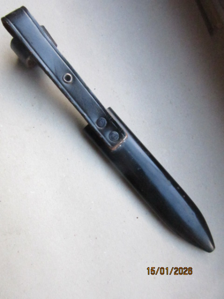 Scheide für einen HJ-Dolch ohne Messer in neuwertigem Zustand. Die Scheide ist natürlich magnetisch. Sie weist alle Merkmale einer Originalscheide aus der Zeit des 2. Weltkrieges auf. Wenn ein Sammler eine Messer in vergleichbarem Zustand hat, ist das die ideale Ergänzung. Das letztel Bild soll zeigen, dass ein Originalmesser passen würde. Versand ins Ausland ist bei diesem Teil möglich, ist aber teurer. Bitte anfragen.