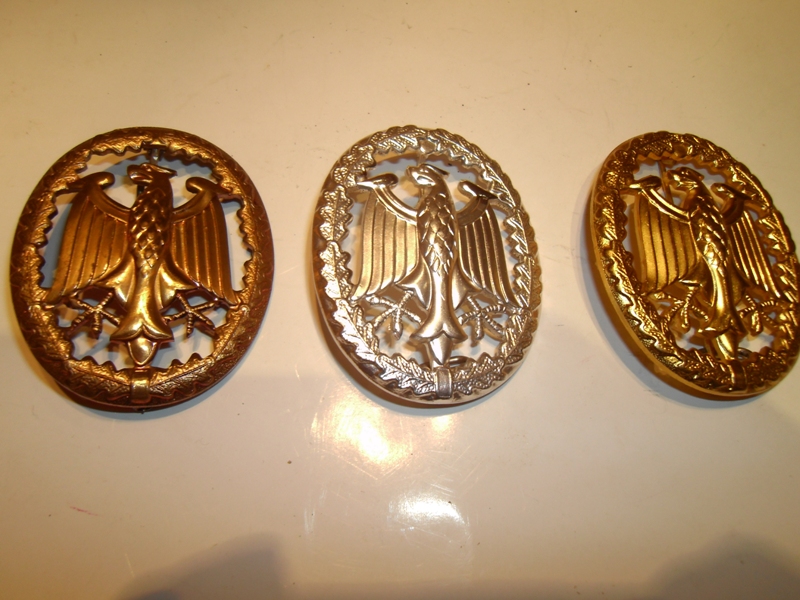 BUNDESWEHR alle 3 LEISTUNGSABZEICHEN in BRONZE + SILBER + GOLD aus Metall, Adler im Kranz, Nadelverschluss auf der Rückseite, Größe ca. 5,5 x 4,4 cm , sehr guter Zustand.