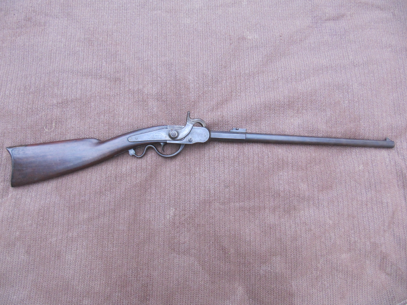Verkaufe einen seltenen, originalen U.S. Gwyn & Campbell Typ II Kavalleriekarabiner im Kal.52 aus dem Bürgerkrieg in einem top Zustand. Er wurde von der Gwyn & Campbell Company aus Hamilton, Ohio gefertigt. Die robusten Gwyn & Campbell Fallblockverschlusslader gehören zu den am leichtesten erkennbaren Waffen des Bürgerkriegs. Sie haben den typischen Hammer und einen großen Abzugsschutz. Dies ist das zweite Modell und hat die entsprechende Seriennummer "21XX", nummerngleich, Fertigung 1863. Insgesamt wurden von 1863–1864 8.202 Gwyn & Campbell-Karabiner im Auftrag des US Ordnance Department erworben. Diese Gwyn & Campbell Karabiner tauchen oft mit gemischten Seriennummern auf, aber dieser passt am Lauf, Rahmen, Block und Abzugshebel überein. Die Schuss und Laderast funktioniert straff, der Lademechanismus schliesst und öffnet exakt. Das originale Piston befindet sich in einem sehr guten Zustand Der Zündkanal ist frei. Das originale Visier hat eine Leiter mit Schieber. Die Oberfläche des 20" Laufes ist glatt, keine Rostnärbchen oder pitting. Die Originalbläuung ist leicht nachgedunkelt. Das sehr gute Laufinnere ist blank mit einem klaren Feld-Zugprofil. Die Schlossplatte ist scharf und vollständig mit dem Herstellerstempel "GWYN & CAMPBELL" in einem Bogen und unter dem Bogen sind "PATENT 1862" und "HAMILTON, O." gestempelt. Am linken vorderen Rahmen ist deutlich der Stempel: " UNION RIFLE " zu sehen. Alle Schraubenköpfe befinden sich in einem einwandfreien Zustand. Der rotbraune, amerikanische Nussbaumschaft ist in einem top Zustand, keine Brüche, Absplitterungen Risse oder Dellen. Auf der linken Rahmenseite befindet sich die Sattelstange mit dem Karabinerring. Die Gesamtlänge beträgt 98cm, das Gewicht 3,2kg. Alle Teile sind original, keine Überarbeitungen oder Ergänzungen. Dies ist ein sehr attraktiver Bürgerkriegskarabiner des schwer zu findenden Gwyn & Campbell Patent. Bei Bedarf können weitere Bilder geschickt werden. Interessenten aus dem Ausland, bitte vor Gebotsabgabe die höheren Versandkosten erfragen.