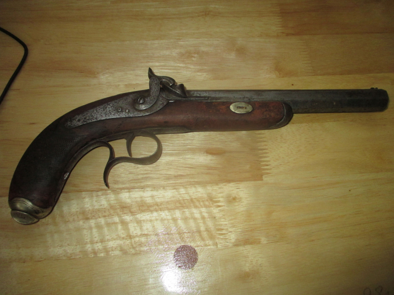 Großer Vorderlader um 1850 . Er lässt sich spannen und abschlagen . Länge zirka 35 cm . Kaliber zirka 13,5 mm .Reparierter Schaft mit Patchbox . Lauf zum aushaken . Preisangebot möglich . Privatverkauf . Keine Garantie oder Rücknahme .