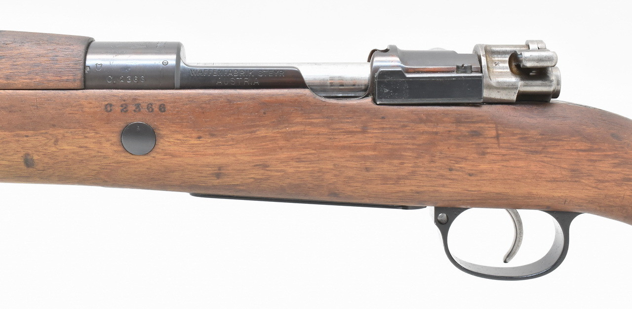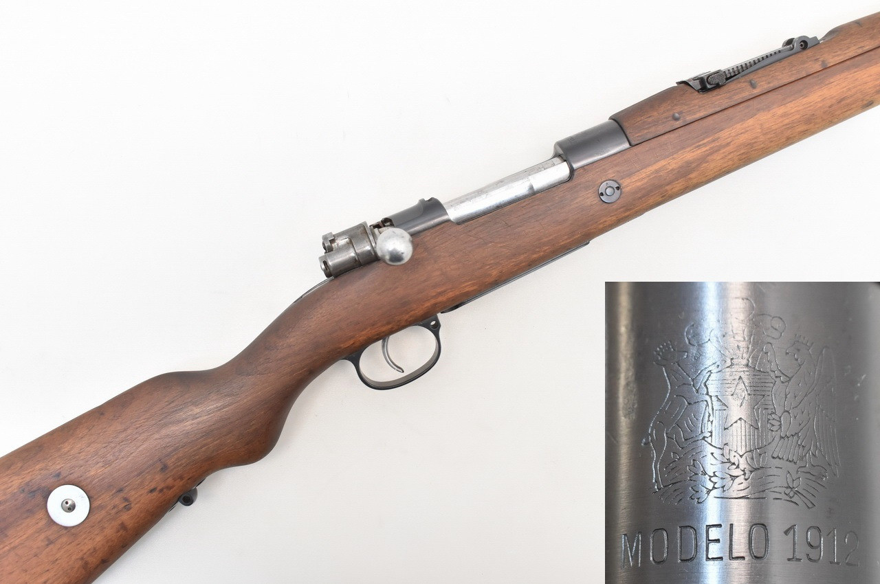Chilenisches Militärgewehr Modell 1912 mit bewährtem " MAUSER " System aus Produktion der Waffenfabrik Steyr, Austria. Hülsenkopf mit chilen. Wappen und Modellbezeichnung " Modelo 1912 ". Blanker Lauf. Beschuß Mellrichstadt 1991. Systemhülse, Magazinkasten und Schaft mit identischer Nummer. Vor längerer Zeit erneuerte Brünierung. Trage-, Gebrauchs- und Lagerungsspuren sind vorhanden. Details siehe Bilder.