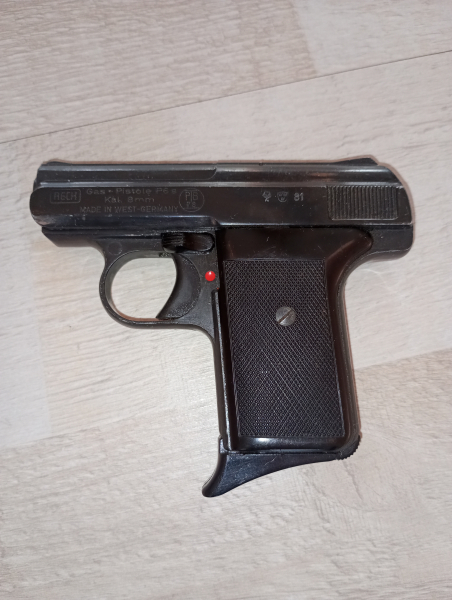 Reck Gas-Pistole P6s Kaliber 8mm PTB 78 Beschuss 1981. Ausschuss nach vorne mit kleiner Laufsperre. In das Magazin passen 6,35 Browning.