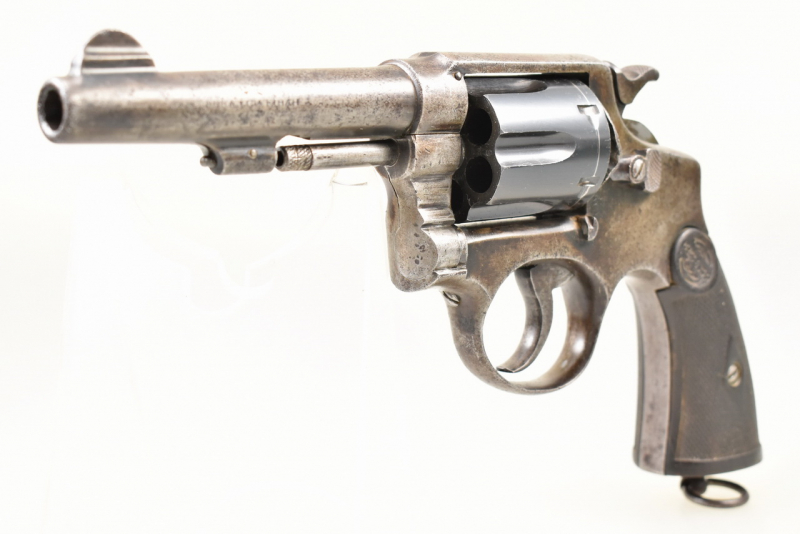 Sechsschüssiger Double - Action Revolver im " Smith & Wesson Modell 1905 Military & Police " Stil aus Produktion des spanischen Herstellers - La Industrial ORBEA, Eibar - in der Ausführung für die französischen Armee. Leicht matter und rauer Lauf. Unrichtig ergänzte Trommel im Kaliber .38 Spec.; Ausstoßer defekt. Horngriffschalen mit Herstellerlogo und Fischhautmuster. Patinierte Metallteile; stellenweise mit Närbchenbildung. Altersbedingte Trage-, Gebrauchs- und Lagerungsspuren sind vorhanden. Details siehe Bilder.