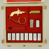Original 24 Kt. Vergoldet Berloque Pistole Schlüsselanhänger. Gerhard Göbharter Austria. Komplette Set in Holzetui, nagelneu.