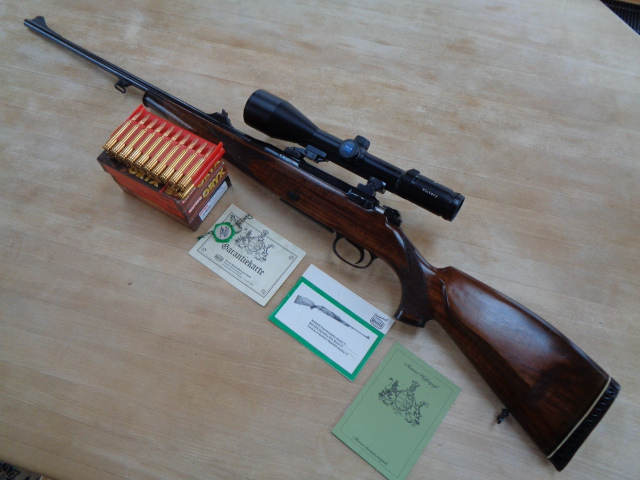 Zielfernrohr ZEISS Victory Varipoint, 3-12x56 (das mit dem Bogen über der "56") Absehen 60. EAW-Schwenkmontage. 3 Schachteln (60 Patronen) NORMA Oryx, 10,1 Gramm. Alle aus 1 Los. Damit sind Sie für die nächste Zeit gut eingedeckt und "warm angezogen!" Zur Waffe gehören weiter 1 Original Mauser Bedienungsanleitung, 1 Original Mauser Waffenpaß, 1 Garantieurkunde der Mauser-Werke Oberndorf/Neckar (siehe Bilder).