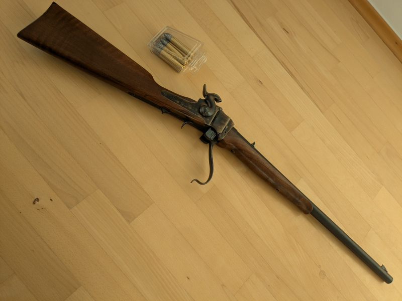 Ich biete eine ungeschossene Pedersoli Sharps mit äußerst geringen Handlingspuren, die Waffe ist fast wie neu. Länge 100 cm, Kaliber .45. Bei dieser Waffe passen die Davide Pedersoli Ladehülsen U517451 ungekürzt, Ich lege ein Paket also 10 Stück Stück mit Geschossen im Originaldesign bei.