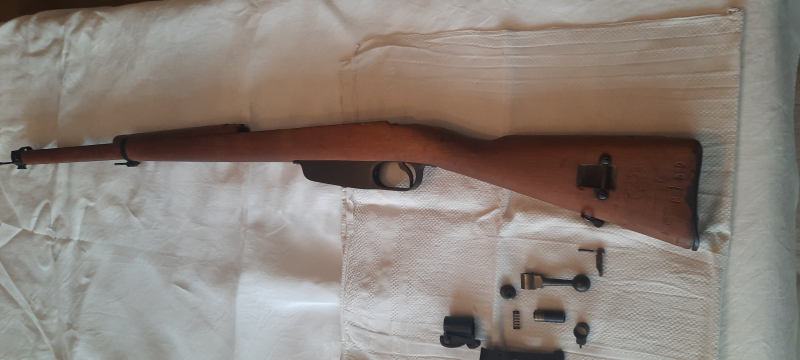 Schaft für ein Carcano Gewehr aus den 40er Jahren mit allen freien Anbauteilen. Der Schaft hat eine Beschädigung im Bereich des Visiers.