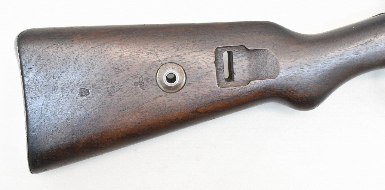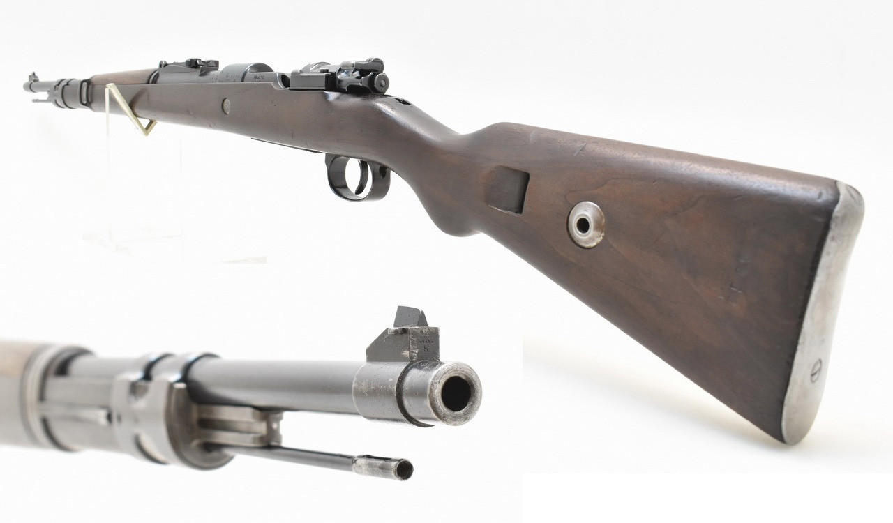 Einschließlich Putzstock nummerngleicher Karabiner 98k / K 98 k mit Herstellercode S / 42 der Mauser Werke AG, Oberndorf a.N. des Jahres 1937. WaA 63 gestempelter Nußbaumschaft mit flacher Kolbenkappe und Schafthohlniete; linksseitig mit portugiesischer Inventarnummer und unklarem Staatswappen. Schöner, blanker Originallauf mit deutschem Militärbeschuß und Ulmer Neubeschuß 1979. Orion Vertriebsstempel. Unüberarbeitete Metallteile mit nutzungsbedingt beriebener Brünierung; diese mit stimmiger Patina. Details siehe Bilder.