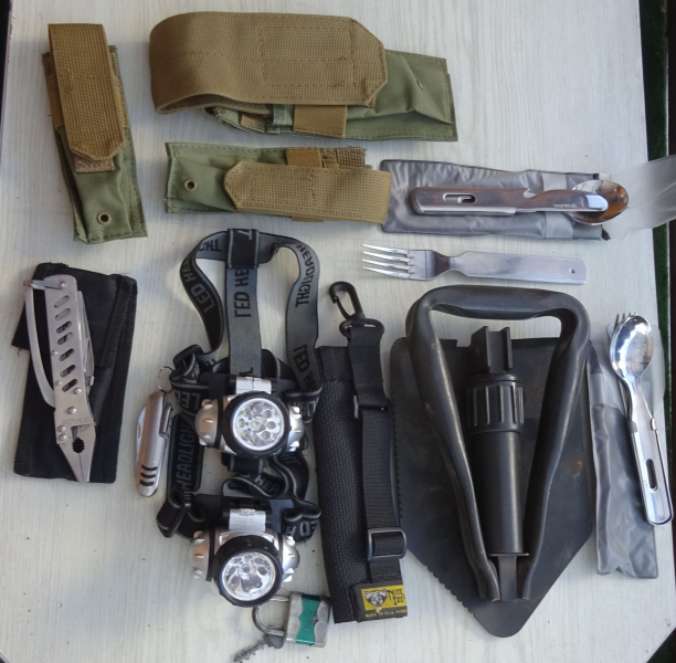 Konvolut Ausrüstung Stirnlampen Klappspaten Taschen
