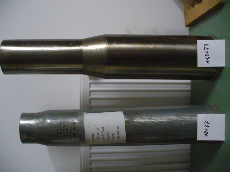 beide Hülsen sind aus Stahl, die T 55 Hülse hat noch original Farbe, die T 62 Hülse ist abgeschliffen. Der lange Hülsenhals der T 62 Hülse erklärt sich dadurch, dass der T 62 als erster eine Glattrohrkanone hatte und die Stabilisierungsflächen des Geschosses im Hülsenhals untergebracht waren.