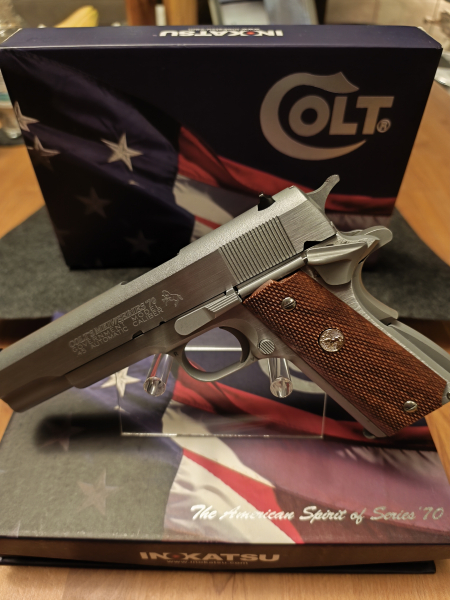 Ein Inokatsu 1911 Stainless Steel Modell Colt Government Mark IV Series '70 in der Vollstahl Edelstahlvariante.