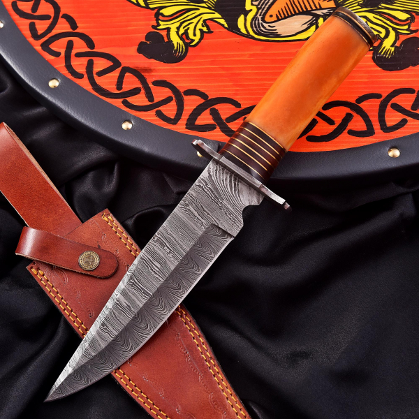 Damascus steel of this knife has high quality contents to give an excellent edge and sharp cutting abilities. Hardness of the blade of this knife is HRC 57-60 in the lab & been hand sharpened to a Sharp Edge.