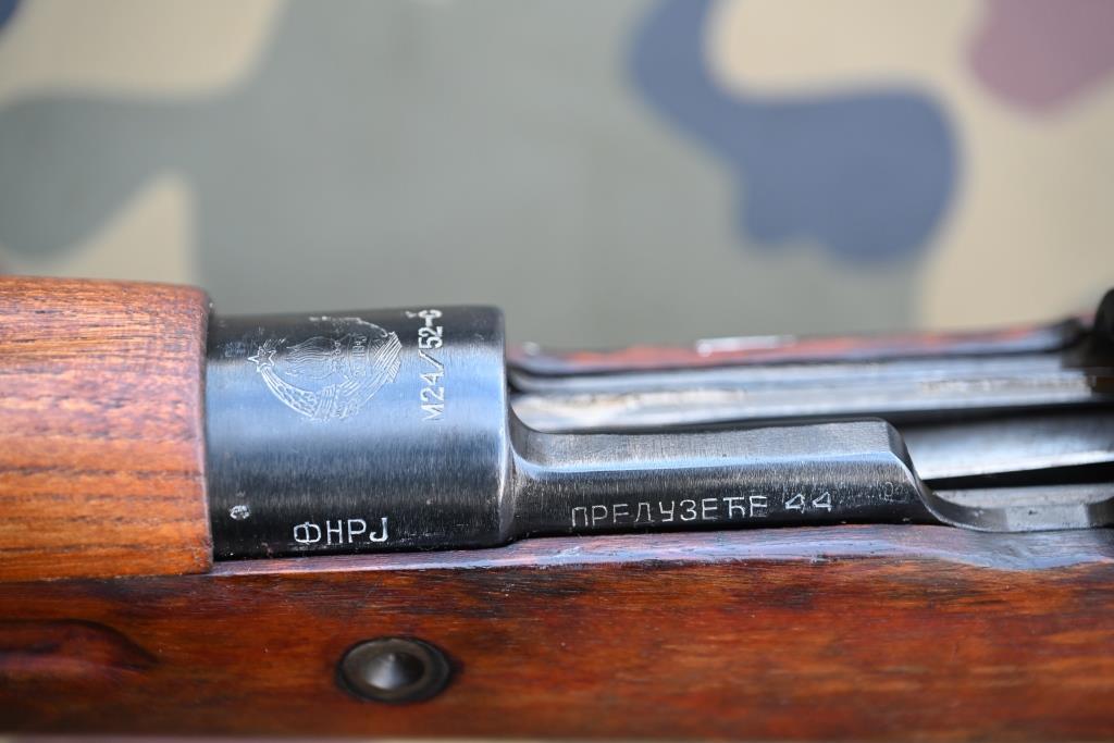 Waffennummer, Herstellerlogo „Preduzece 44“ links auf der Systemhülse in kyrillischer Schrift und Typbezeichnung "Mod. 24/52-C" oben auf der Hülse, darüber Landeswappen Jugoslawien. Vereinzelt noch alte „WaA“-Stempel: Auf Sperrriegel 2 x "WaA280" (= ERMA), auf Kolben-Stempelplatte "WaA...4".